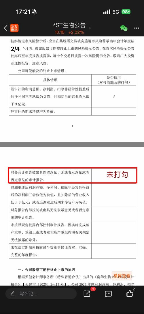 $*ST生物(SZ000504)$ 尘埃落定,年报必定没有问题。四季度业绩大增,主要在于金弘新四季度的产值很大,今天在“财务会计报告被出具保留意见、无法表示意见或者否定意见的审计报告”这一栏依旧没打勾,内控也没打勾,意味着审计并没有质疑他有业绩突击嫌疑,结合明天就要再次出年报业绩预告,这意味着认可年报的业绩。摘帽真正可以倒计时了!