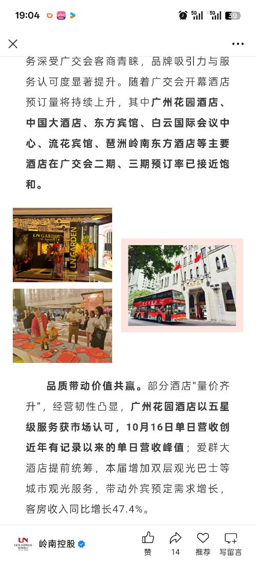 $岭南控股(SZ000524)$第138届广交会第一期昨天结束,10月23-27日将迎来第二期。本届广交会创下历史最大规模,展位总数7.46万个,参展企业超3.2万家。“中国第一展”的强劲吸引力已迅速辐射至广州文旅市场,岭南控股旗下酒店、餐饮、入境游等相关业务迎来新一轮消费高峰。广州花园酒店、广州宾馆、流花宾馆、爱群岭居、琶洲东方酒店及白云国际连续多日满房;广之旅入境游接待人数同比增长10%。