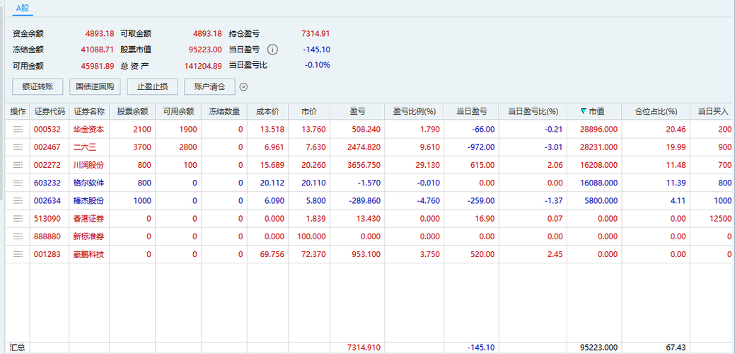 $二六三(SZ002467)$$华金资本(SZ000532)$$川润股份(SZ002272)$ 盘中亏2000收盘亏150,侥幸了。 昨天抄底棒杰股份今天差点埋了,好在尾盘拉起来点。 川润有点搞不懂了,是因为通信ETF涨太多带起来么还是走起来趋势稳定了。 仓位多一点的二六三被年报影响,高位利空是真利空,低位利空是利好啊。 豪鹏清了赚了1000多,换了个软件股格尔软件做几天看看怎么事。 CPO太猛了...