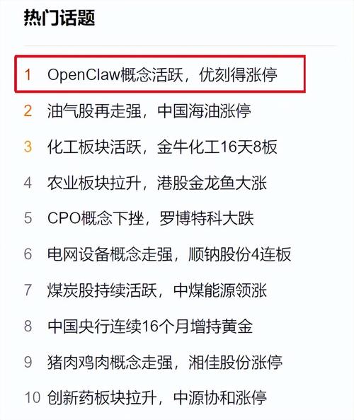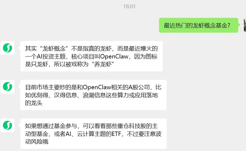 下班到家,看到热门话题第1名是“OpenClaw概念活跃,优刻得涨停”。 好奇去问了一下元宝,最近热门的龙虾概念基金有哪些。 元宝说, 其实“龙虾概念”不是指真的龙虾,而是最近爆火的一个AI投资主题,核心项目叫OpenClaw,因为图标是只龙虾,所以被戏称为“养龙虾”。目前市场主要炒的是和OpenClaw相关的A股公司,比如优刻得、汉得信息、浪潮信息这些算力或应用落地的龙头,如果想通过基金参与,可...