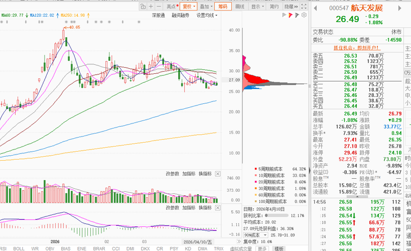 $航天发展(SZ000547)$ 航天发展周五收26.49,跌1.08%,成交额33.77亿,比周四缩量,这是正常回踩。这票是商业航天+数字蓝军双概念,目前筹码平均成本28元,现在是主力在26-27元区间吸筹,准备二次拉升。消息面有长征六号改发射卫星互联网的利好,公司卫星业务直接受益,还有5家机构给出12个月目标价36.5元,上涨空间34.4%。周五主力资金净流出1.2亿,是故意打压。今天预判走势...