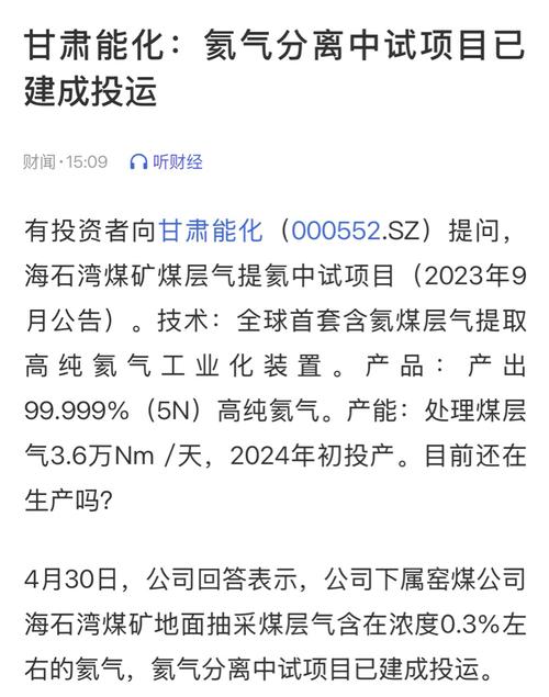 - 《 今天股市:氦气概念股逆市爆发 》 . 甘肃能化的氦气产能情况 : 基于其全球领先的煤层气提氦技术;目前通过海石湾煤矿项目稳定产出高纯氦气 。 - 技术:全球首套含氦煤层气提取高纯氦气工业化装置 。 - 产品:产出99.999%(5N)高纯氦气 。 - 产能:处理煤层气3.6万Nm/天,于2024年初投产 。 - 官方认证:入选2023年度甘肃省属企业,十大科技成果 。 - 甘肃能化是国内唯一掌握煤层气提氦成套技术,并工业化落地的企业; 具备明确的技术优势和行业地位 。 - 该项目不仅是资源综合利用的典范,也为国家能源安全和战略性稀有气体自主供应做出了贡献 。 下一步: 可持续关注甘肃能化,后续氦气产能的扩张计划;及市场应用拓展情况 。