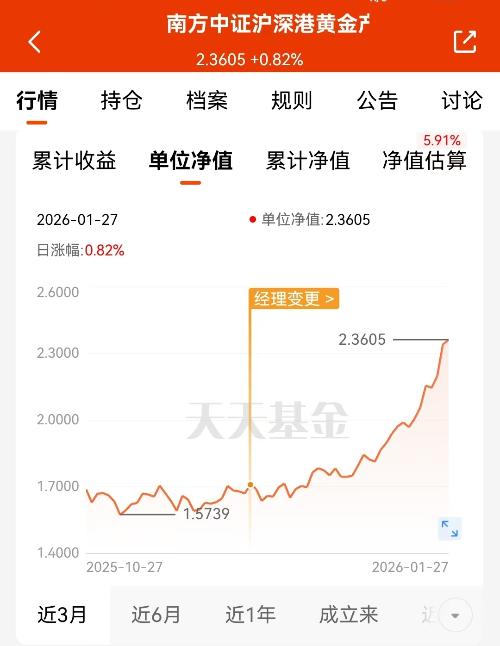 金价这波涨到了5200美元以上,年初至今的涨幅接近20%,引起了市场的广泛注意。通过基金方式来参与黄金投资是一个常见选择,比如这只$南方中证沪深港黄金产业股票指数发起C$(021959)。它主要覆盖黄金产业链,10元起购,对资金量要求很小,费用结构也通常比实物黄金更经济。业绩表现上,近一个月上涨31%,近半年上涨85%,在同类产品中,其近6个月排名第1,并且已经连续六期位列第一,近1年排名同样是第...