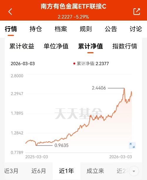 看到早盘那波拉升,有色又开始活跃了。我琢磨着行情可能要轮动到这,就买了些$南方中证申万有色金属ETF发起联接A$(004432)。看看历史走势,整个板块去年涨了92%,这力度在去年那种环境里算很突出了。现在很多迹象都对它有利,生产端受限、库存走低,消费端倒是稳中带升,这种错配容易产生持续性机会。我看过它的业绩,近一年净值翻了一倍,这种表现确实吸引人。#全球股市集体大反攻你的仓位配置如何?#