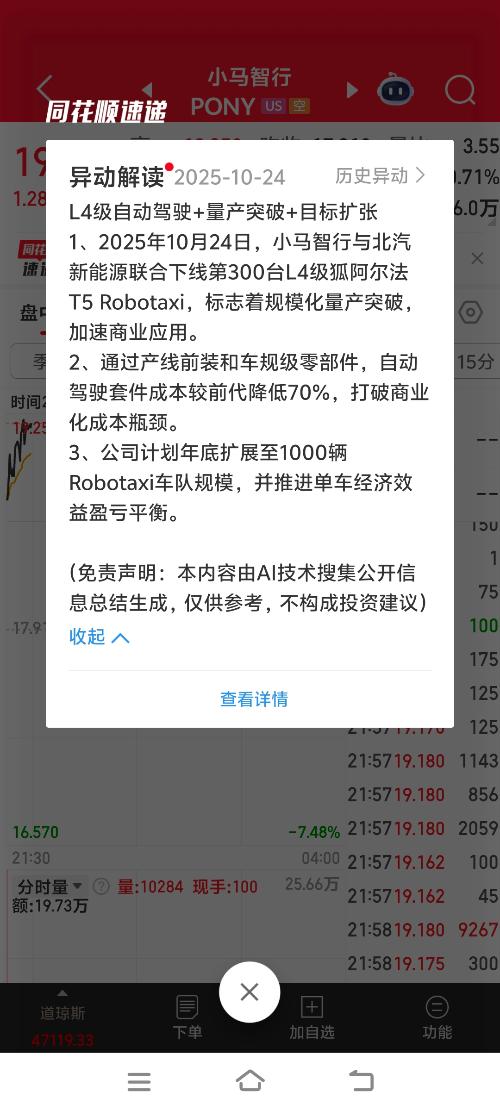 534- 一万年太久,只争朝夕。股友们,温馨提示:近日,由小马智行与北汽新能源联合打造的第300台极狐阿尔法T5 Robotaxi正式下线,标志着双方合作迈入规模化量产的新阶段,也意味着“北京方案”下的中国L4级自动驾驶量产路径正逐步成型。 《中国经营报》记者了解到,极狐阿尔法T5 Robotaxi通过深度整合小马智行的前沿自动驾驶技术与北汽新能源的高端制造体系,已成为中国Robotaxi领域的重要标杆,为智能网联汽车产业提供了可复制的落地样本。 小马智行创始人兼CEO彭军与北汽集团副总经理刘宇共同见证了这一里程碑时刻。该车型自今年7月启动量产以来,搭载小马智行第七代自动驾驶量产方案,具备全天候、全场景、全时段的自动驾驶能力。在2025世界智能汽车大会期间,双方首次将该车型带到大会现场,获得来自政府机构及国内外专家的高度关注与认可。 从“可行”到“可量产”:L4自动驾驶加速落地 彭军表示,第七代Robotaxi实现了“生产即导向运营”的闭环——每一台下线车型都具备全无人驾驶能力,可直接投入测试与服务运营。这不仅显著缩短了技术验证周期,也为Robotaxi商业化提供了现实路径。 自启动合作以来,小马智行与北汽新能源已在正向研发、产线建设、供应链体系与道路测试等方面实现全面打通。随着量产提速,极狐阿尔法T5 Robotaxi计划率先在国内一线城市部署,并同步规划中东、欧洲市场的出行服务,推动L4级技术由本土创新走向全球应用。 这一进展标志着小马智行正从前沿技术探索迈向商业化落地的关键跨越。该车型已获得北京、深圳等地的智能网联汽车道路测试许可,为后续规模化运营奠定了基础。