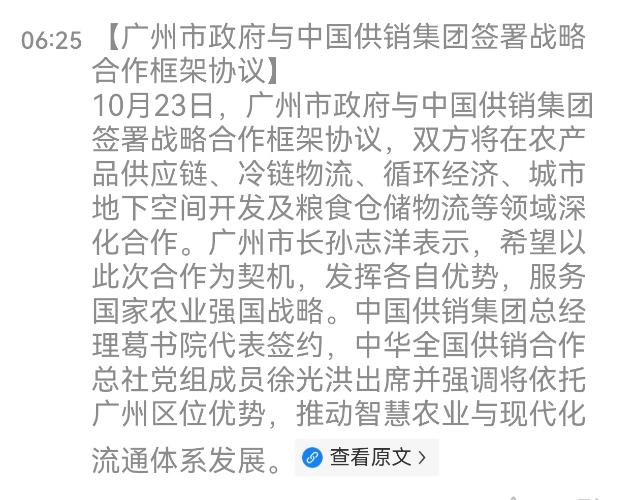 一万年太久,只争朝夕。股友们,敲黑板,划重点!紧急重要温馨提示,最新重磅利好消息:10月23日上午,广州市政府与中国供销集团在穗签署战略合作框架协议。市长孙志洋、中华全国供销合作总社党组成员徐光洪出席并见证协议签署。副市长胡浩、中国供销集团总经理葛书院代表双方签署协议。根据广州市政府与中国供销集团签署的战略合作框架协议,双方将发挥自身领域综合优势,在农产品供应链建设、循环经济、城市地下空间开发与利...