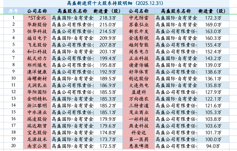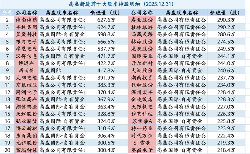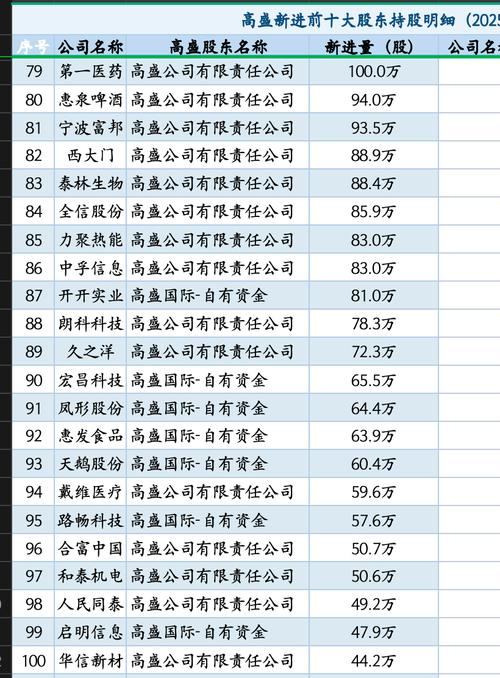 刚刚,高盛大幅新进了107个A股股票,都是直接买进前十大股东的,其中海南海药新进627万股,成为第8大股东,丰林集团新进了625万股,成为第6大股东,其中新进股票数量超过300万股的有20个。$海南海药(SZ000566)$$丰林集团(SH601996)$$摩恩电气(SZ002451)$ 新进股票超过200万股的有46个。新进股票超过100万股的79个,华斯股份,福日电子,航天动力,天润乳业,华阳...