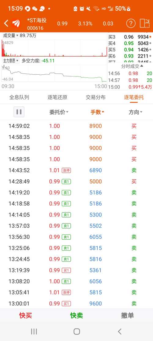 海投被恶意退市,不能支持大股东!!!2023年6月8日000616大股东恶意退市:6月8日,*ST海投盘中反复触及涨停,股价最高涨停达1.01元/股,最终收报0.99元/股退市,当日如大股东肯出力应不会退市(最后三分钟大股东仅买入2万多手),当日大股东回购账户资金还剩下1644.59万元(6月12日公告编号:2023-074)。6月8日最后三分钟大股东只要多买2万手肯定不退市。6月13日公告20...