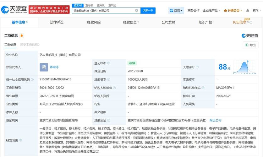 天眼查App显示,近日,亿安智航科技(重庆)有限公司成立,法定代表人为蒋瑜涛,注册资本1亿人民币,经营范围包括智能无人飞行器制造、智能无人飞行器销售、人工智能理论与算法软件开发等,由长安汽车投资(深圳)有限公司、亿航智能设备有限公司共同持股。