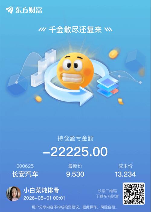 $长安汽车(SZ000625)$亏的睡不着觉,五一放假却一点高兴不起来,有男生约我出去玩,我都没心思去了,当初怪自己太相信长安汽车股票了,以为是央企蓝筹股,每年还有分红,想着在13块多买进去应该是底部了吧,却没想到股票一泻千里,现在股价已经跌破10了,我真不知道我还能抗住多久!炒股真的很难受……最后祝大家五一节快乐