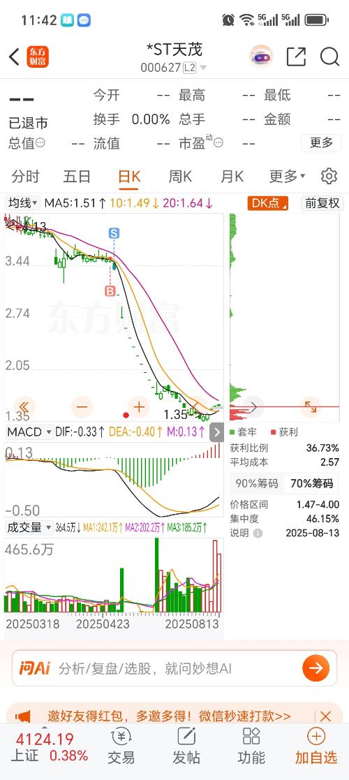 $*ST天茂(SZ000627)$只有等1000挂了,崽卖爷田时会有一把的