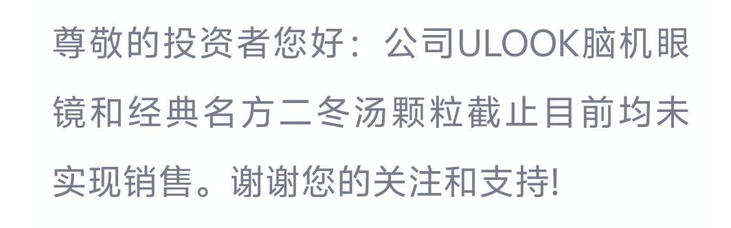 仁和药业:尊敬的投资者您好:公司ULOOK脑机眼镜和经典名方二冬汤颗粒截止目前均未实现销售。谢谢您的关注和支持!