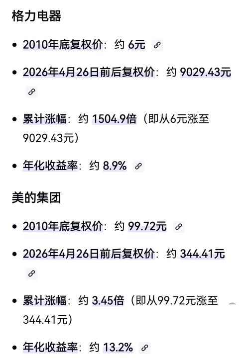 $格力电器(SZ000651)$$美的集团(SZ000333)$ 俺也豆包一下,豆包给出了2010年以来格力涨1504.9倍,美的3.45倍的数据。同时豆包也给出了涨千多倍的年化收益率是8.9%,涨几倍的年化收益率是13.2%。 信豆包,裤衩包没。查豆包,股盲专属。