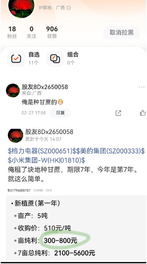 $美的集团(SZ000333)$广西甘蔗八婆53元满仓格力至今年年股市亏钱难怪牠戾气这么大。一亩甘蔗一年赚300,天天刷屏的甘蔗八婆是不是不知道甘蔗是种一次割3年一般承包地都是3年,6年,9年牠居然承包了7年最后一年当冤大头被地主割。一个连种地都种不明白的八婆炒股怎么可能赚钱!$小米集团-W(HK|01810)$$格力电器(SZ000651)$
