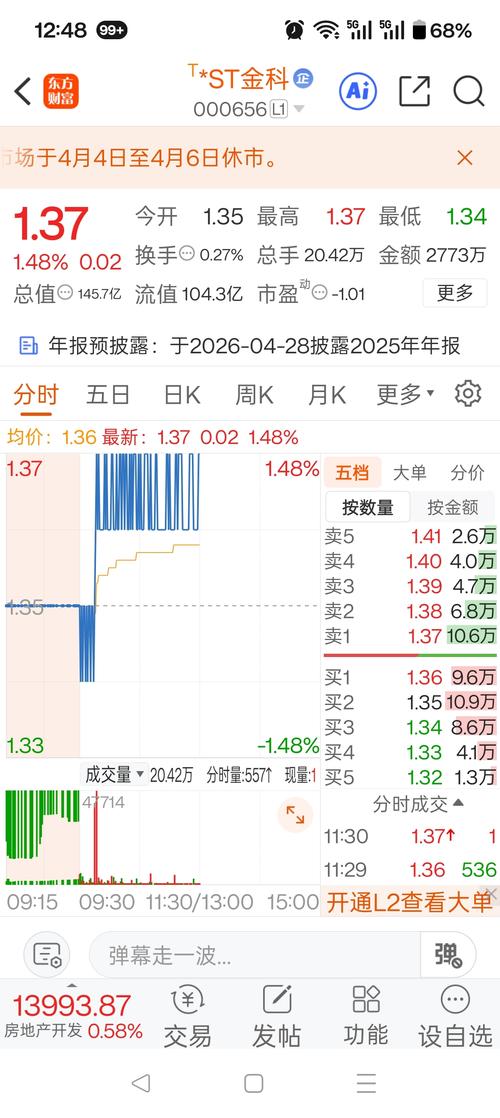 $*ST金科(SZ000656)$金科要涨了,不涨不买,再涨就卖。1.37可以考虑买入了。