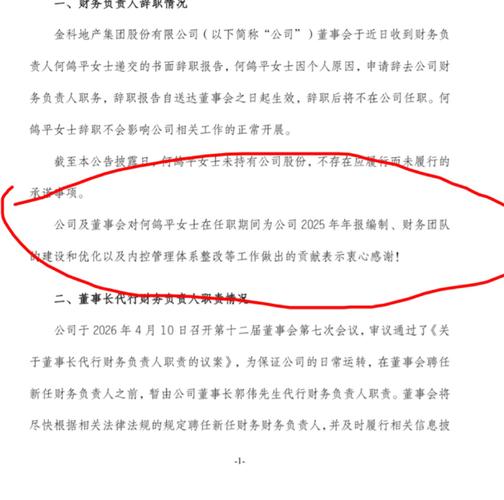 $*ST金科(SZ000656)$ 思考过程: 好的,我现在需要回答用户的问题:“金科股份财务负责人突然出逃意味如何呢?”首先,我要仔细分析提供的检索信息,找出与何鸽平辞职相关的所有内容,并结合其他相关信息来推断可能的含义。 首先,根据公司公告[1],何鸽平因个人原因辞职,辞职后不再任职。公告中提到她的辞职不会影响公司工作,但用户提到“突然出逃”,可能暗示有更深层次的原因。需要查看是否有其他信息支...