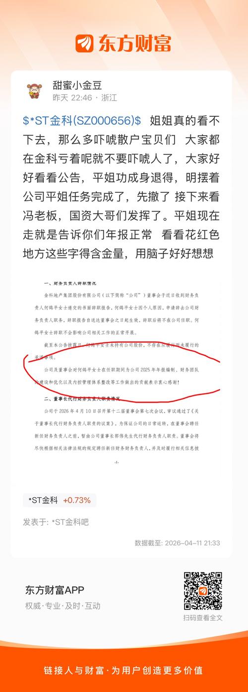 $*ST金科(SZ000656)$姐姐真的看不下去,那么多吓唬散户宝贝们大家都在金科亏着呢就不要吓唬人了,大家好好看看公告,平姐功成身退得,明摆着公司平姐任务完成了,先撤了接下来看冯老板,国资大哥们发挥了。平姐现在走就是告诉你们年报正常看看花红色地方这些字得含金量,用脑子好好想想