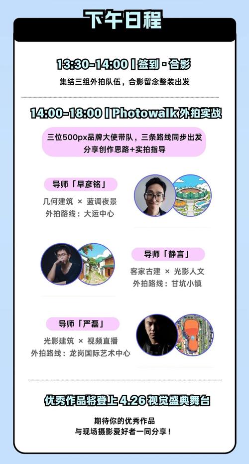 活动地址 (点击地图可跳转导航) 报名链接 (需备注photowalk参与路线) 视觉盛典主活动 深圳站|2026视觉盛典开启招募! 往期回顾 与候鸟相伴|永修站Photowalk影像回顾 泉州Photowalk圆满结束,这些故事正在被看见 Photowalk有多好玩?摄影师连续三次专程参加 漫步贵州,定格美好:这场Photowalk藏着太多动人瞬间 快门定胜负|重庆Photowalk精彩回顾 [END]...