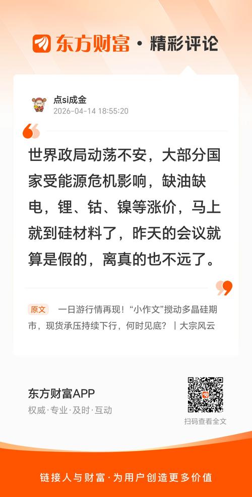 世界政局动荡不安,大部分国家受能源危机影响,缺油缺电,锂、钴、镍等涨价,马上就到硅材料了,昨天的会议就算是假的,离真的也不远了。 我在《一日游行情再现!“小作文”搅动多晶硅期市,现货承压持续下行,何时见底?|大宗风云》的评论获得了大家的关注。