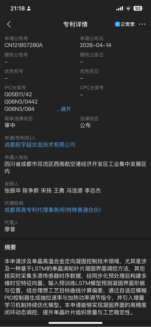 $ST炼石(SZ000697)$ 核心结论 这是成都航宇超合金(炼石航空子公司)2026年4月14日刚公开的发明专利。目前全国范围内没有完全相同的专利,但其技术路径属于行业前沿探索;该专利意义重大,是AI深度赋能航空发动机“卡脖子”环节的标志性突破。 一、全国是否有同类专利? 1.没有完全一致的专利 •独家性:通过专利数据库检索,公开号CN121857280A为成都航宇超合金技术有限公司的独家申请...