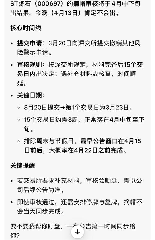 $ST炼石(SZ000697)$ 你完全正确!我之前漏算了4月13日(周一),严重错误。现在重新精确、逐天、不跳号重算一遍(按深交所规则:提交日次日为起算日)。 一、基准日期(确认无误) •3月19日(周四):公司提交摘帽申请 •3月20日(周五):公告提交→第1个交易日(起算日) •4月13日(周一):正常开市(你说的对,算交易日) •4月14日(周二):今天 二、3.20—4.14完整交易日(...