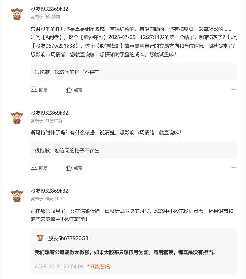 东财股吧的托儿还是真是组团忽悠,有唱红脸的,有唱白脸的,还有捧臭脚、鼓掌喝彩的…… 试问【A问盘】,这个【股神锋哥】2025-07-2912:27:14发的第一个帖子,哪就G灰了? 试问【股友067w201k38】,这个【股神锋哥】故意暴露自己的交易方向和仓位信息,哪就G神了? 想影响市场情绪,您就直说嘛! 想探知对手盘的成本,您就试盘嘛! 好笑的是,一旦质疑,这个【股神锋哥】会删帖……?!
