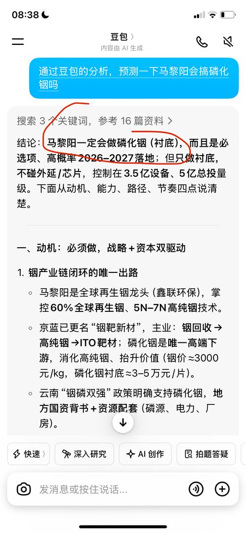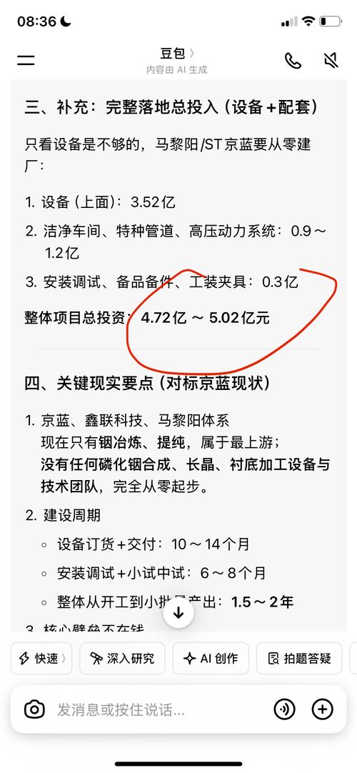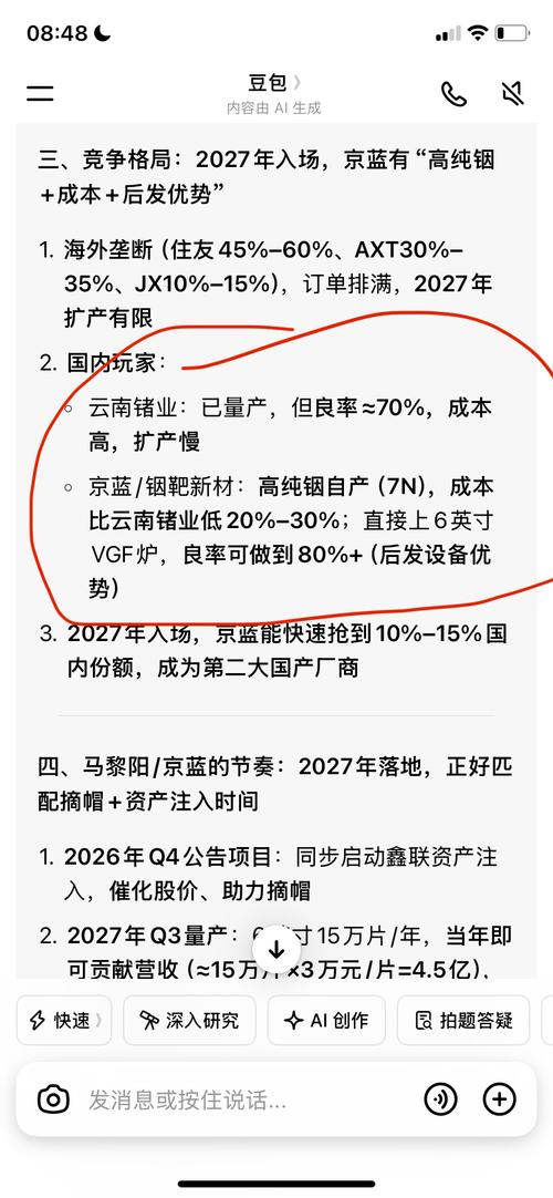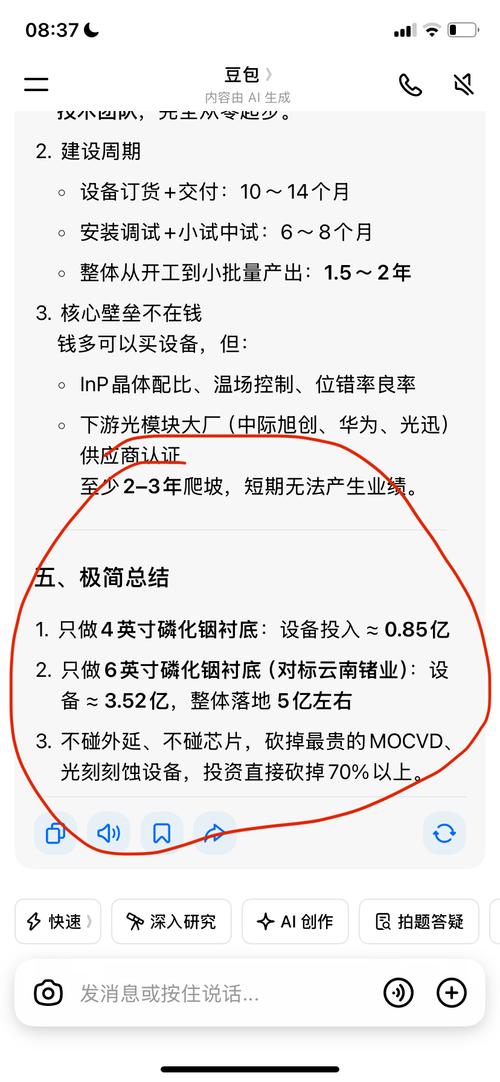 $ST京蓝(SZ000711)$按照马总的格局,今年有没有可能投资搞6英寸磷化铟(衬底)晶片呢 一个生产加工型企业的掌舵人,没有理由只生产低附加值产品,不想搞高附加值的产品。那么按马的字典里,就止步粗铟,精铟和靶材了?云南锗业的4英寸磷化铟晶片是针对中低端客户的,而马总如果直接干6英寸的针对中高端客户群的,无疑发展的更久远。而通过豆包分析,只需投资5亿左右,购买高温高压的锅炉,就可以生产了。 欢迎...