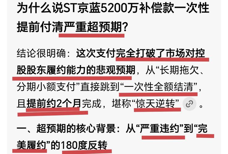 $ST京蓝(SZ000711)$在整个A股市场,拖到最后期限给补偿款都是常态,在ST板块,不仅会拖,还常在最后一天继续延期,ST京蓝却惊天动地地突发性提前两个多月将【半个多亿】全部提前足额还清! 不是提前两天,不是提前两周,是比公告承诺期限(6月30日)提前了整整两个多月!这个举动不仅展示了公司实控人雄厚的资金实力,更是侧面反应了实控人对京蓝长期市值和发展的信心。 经历5天翻天覆地的洗盘后,今天京...