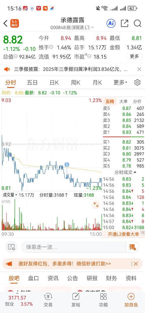 $坚朗五金(SZ002791)$$苏宁环球(SZ000718)$$承德露露(SZ000848)$ 上周四开仓买的这三只,拿了一个星期,亏了不到3个点,今天都清仓了。这一个星期只有苏宁环球最高盈利6个点时没卖,今天也是微亏卖的。这么好的行情,这三只居然都是绿色的,太不爽了,都清了。