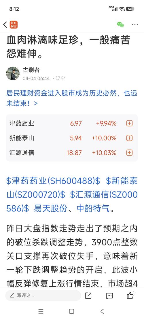 $津药药业(SH600488)$$新能泰山(SZ000720)$$汇源通信(SZ000586)$ 昨日大盘指数受清明小假期外围股市超跌反弹上涨的影响,走出了低位反复震荡整理,小幅上涨的走势,指数本身涨幅不大,收盘收出缩量小阳十字星线,此为变盘节点信号,今日大盘指数面临方向性选择,市场出现了普涨态势,近4000只股票上涨,但成交量却再度出现萎缩,这不算是好的信号,市场做多情绪重新凝聚回暖,大有“沉舟...