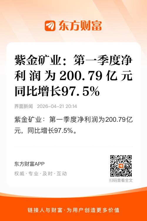 紫金矿业:第一季度净利润为200.79亿元,同比增长97.5%