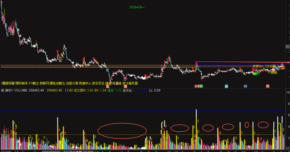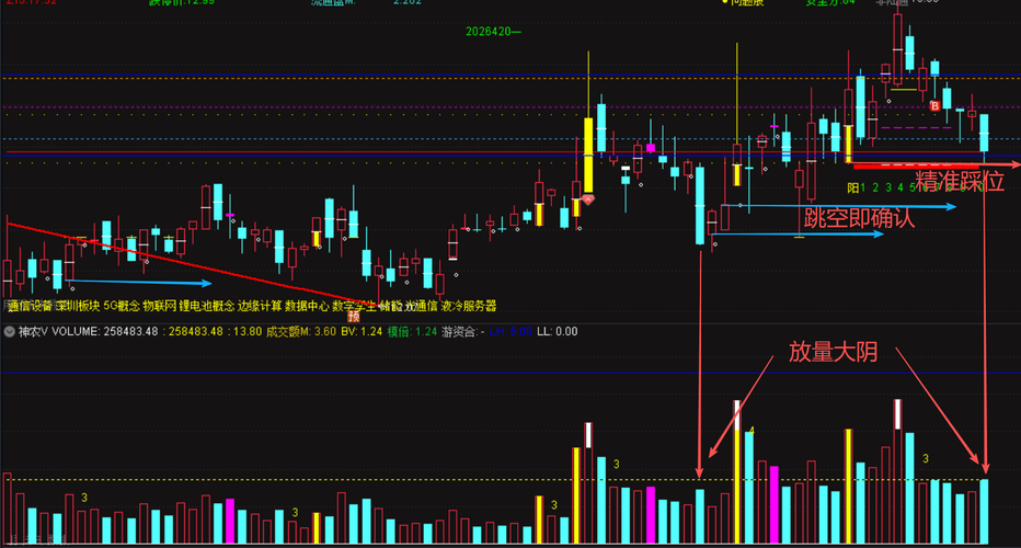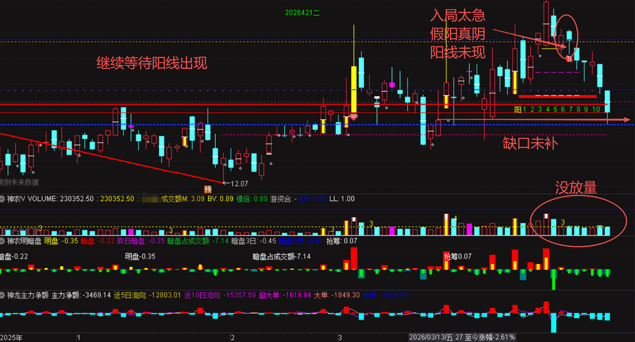 今天拿一只,随便聊聊点技术: 上图想分享或说交流的: 一,今天精准踩位大阳底, 二,大阴放量,前面同样的组合,次日跳空反弹。 三,成交量前面对比,似乎当前成交量已到前低了,成交量低即预示可能变盘。 再看一幅图: k线筑底,风平浪静,但成交量却翻江倒海,即暗流动涌动。 个人看法:后面不破精准踩位那个位置,跳空高开或过阴线21或反包,都可能就是最佳入点,