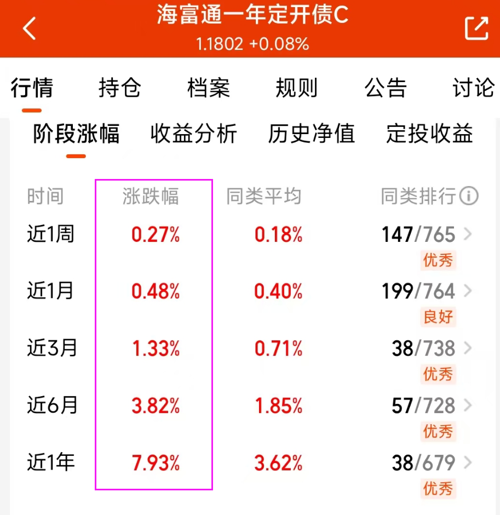 A股已经连涨三天了,风险是涨出来的,现在要注意风险了,可以适当减仓落袋为安,今天债市也是大晴天,利率债26红2绿,信用债16红10绿,2年期国债期货+0.05%,10年期国债期货+0.04%,同业存单13红3绿,整体来看各类债种今天涨势都不错,股债双收,赚钱效应加倍。加1000$海富通一年定开债C(OTCFUND|001976)$,这只基金适合我们“早八人”存钱,风险低波动小长期稳健,近一周收27...
