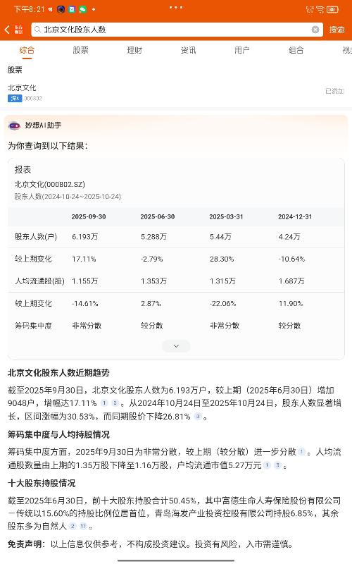 资讯 北京文化股东户数增加17.11%,户均持股5.27万元