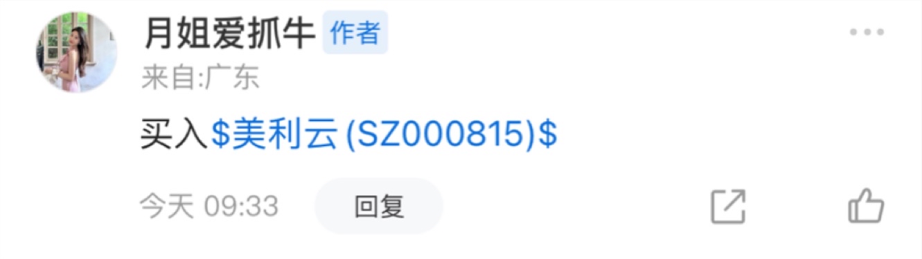 $美利云(SZ000815)$明天美利云可攻可守,从均线上看,已基本调整好!从量价上看,筹码锁定良好,该走已走想留已留,随时就能突破平台!这股股性活泼,主力很给面子不套人,这是牛股特征!末学在这股进进出出做了好几波,对它小有感情!美利云概念纯正,筹码锁定良好,形态稳健,明天如能收红3个点就会引起市场关注!如此,则后天能强势涨停,最少也能做成仙人指路形态!末学明天将逐渐建仓,最迟后天给到4成仓位!让...