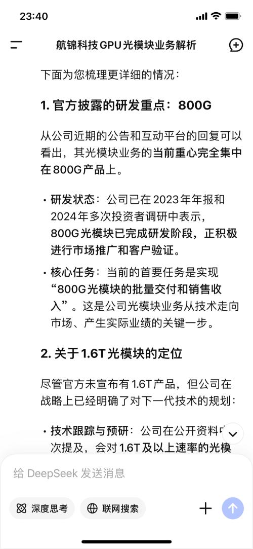 $航锦科技(SZ000818)$ 光模块:航锦科技光模块业务的主体为控股子公司超擎数智。公司已推出多种型号的800G光模块,如MMS4X00-NS、MMS4X00-NM等,面向不同配置及传输距离的交换机互联。其800G光模块销售情况良好,市场反响热烈,凭借高传输速率、低延迟和较强的抗干扰能力,成为数据中心、高速网络等场景的重要选择。此外,公司还在进行1.6T光模块的研发,展现了技术前瞻性。超擎数智...