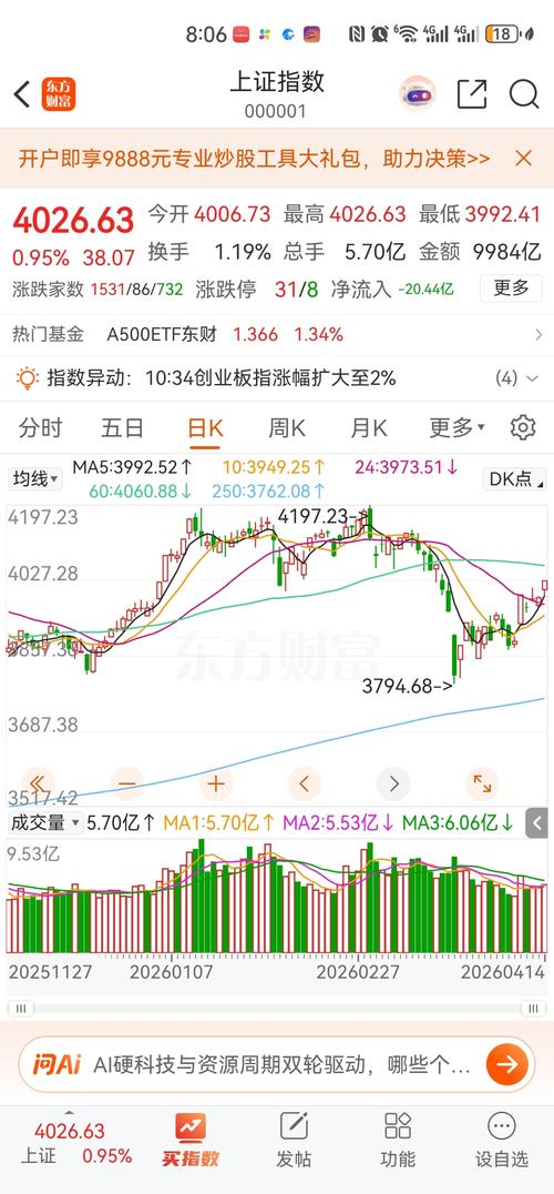 今天大盘尾盘大幅拉升,放量收光头中阳线,3月23日3794见底以来第一次收盘站上了30日线和4000点。预计明天大盘会冲60日线,冲高回落收小阳。 主升行情什么时候开始加速拉升,关键看美伊什么时候签订停火协议(我觉得快了,虽然谈判会有反复,但美国在内外压力下急需停战)。如果第二轮谈判破裂,大盘会在4000附近震荡,不会有大跌。如果美伊签订停火协议,大盘会V型反转。