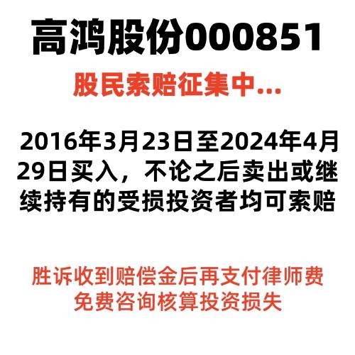 $*ST高鸿(SZ000851)$2024年4月29日,高鸿股份(000851)公告因涉嫌信息披露违法违规被证监会立案调查。经查,公司2015年至2023年通过虚假贸易虚增营收,且2020年定增构成欺诈发行*。公司随后被实施退市风险警示,股价连续下跌,投资者损失惨重。 凡在2016年3月23日至2024年4月29日之间买入000851高鸿股份,且在2024年5月6日(含当日)之后卖出或继续持有者,...