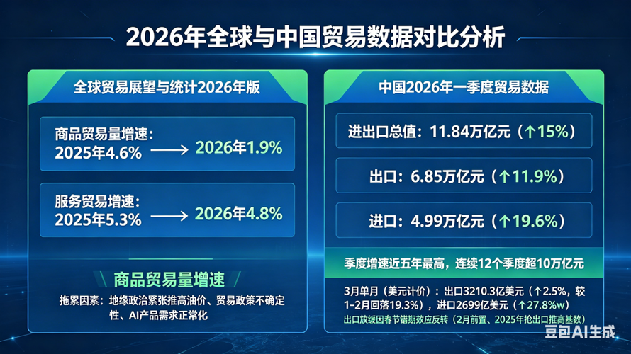 2026年第一季度全球贸易数据于4月中旬陆续出炉,为观察中国外贸在全球坐标系中的位置提供了重要窗口。在世界贸易组织(WTO)预计2026年全球商品贸易量增速将放缓至1.9%的背景下,中国一季度货物进出口以15%的同比增速交出亮眼成绩单,历史同期首次突破11万亿元大关,成为全球经济复苏中的一抹亮色。一、全球贸易放缓与“中国速度”的鲜明反差3月下旬,WTO发布《全球贸易展望与统计》2026年版报告,预...