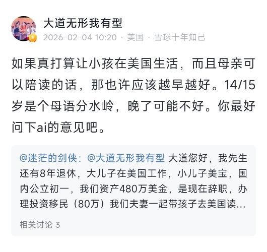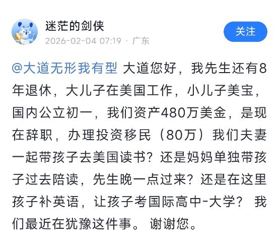 网友:大道您好,我先生还有8年退休,大儿子在美国工作,小儿子美宝,国内公立初一,我们资产480万美金,是现在辞职,办理投资移民(80万)我们夫妻一起带孩子去美国读书?还是妈妈单独带孩子过去陪读,先生晚一点过来?还是在这里 孩子补英语,让孩子考国际高中-大学?我们最近在犹豫这件事。谢谢您。 大道:如果真打算让小孩在美国生活,而且母亲可以陪读的话,那也许应该越早越好。14/15岁是个母语分水岭,晚了可...