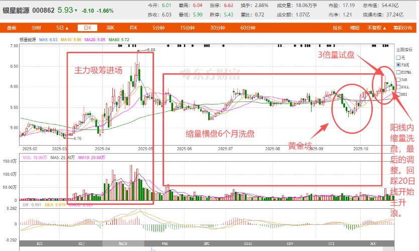 $银星能源(SZ000862)$写在跨年妖股前夕:主力在4月份开始大资金进场,打出最高点6.88。然后开始了6个月的横盘整理,最低5.19,最高6.27,均价5.7;9月下旬放量阴线挖坑,回踩5.2附近确认支撑,4天-2天-4天,完美黄金坑;公布三季报当天放3倍量拉高试盘,随后4根阴线在第1根大阳线内缩量微调,为主升浪做最后的铺垫。 股价5.93元,流通6.28亿股,国资控股央企改革,新能源碳中和...