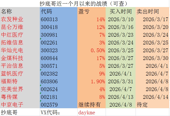 近月战绩不错 各位股友们好: 跟大家说一下,最近一个月在股市操作顺利,整体保持盈利,战绩不错。感谢大家一直以来的关注与交流。 因个人时间与精力安排,即日起,后续将不再提前发个股分享。 这段时间和大家一起看行情、聊市场、交流心得,收获很多。也祝大家在市场里稳健盈利、控制风险、投资顺利。 祝大家投资长虹,账户长红! 温馨提示:以上仅为个人近况分享,不构成任何投资建议。理财有风险,投资需谨慎。