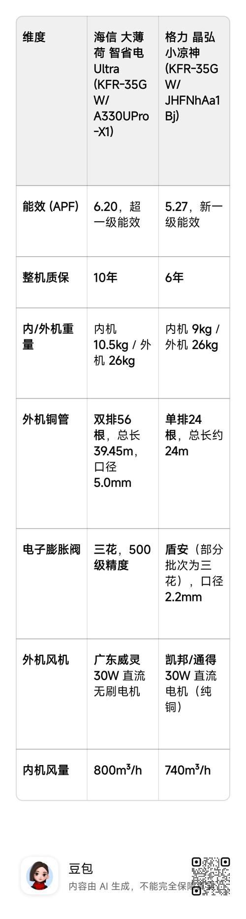 $格力电器(SZ000651)$$海信家电(SZ000921)$同价位的格力和海信,哪个更加有诚意!下面看对比! 这两款空调的核心差异,简单说,海信是“性能堆料派”,格力晶弘是“核心可靠派”。 1.能效与用料:海信完胜,省电更彻底 海信的APF值6.20远高于格力晶弘的5.27,这背后是实打实的用料升级:内外机均为双排铜管(外机总长近40米),配合三花500级高精度电子膨胀阀,换热效率更高,控温更...