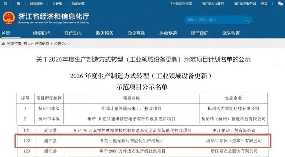 UNITTECNEWS 近日,浙江省经济和信息化厅公示了关于2026年度生产制造方式转型(工业领域设备更新)示范项目计划名单,众合科技控股子公司海纳股份旗下海纳半导体(金华)有限公司凭借半导体领域高端设备的前瞻性布局、智能化生产的高标准规划及行业示范引领作用成功入选。此次入选是政府部门对金华海纳在生产制造方式转型、高端化智能化绿色化发展方面创新实践的高度认可,更是其在工业领域设备更新升级中标杆地位...