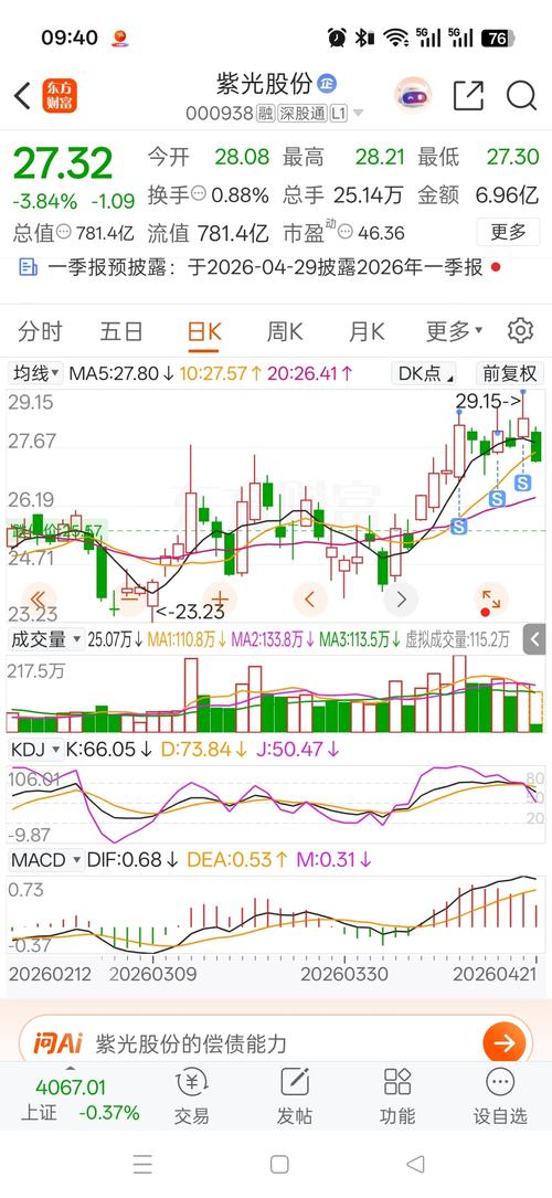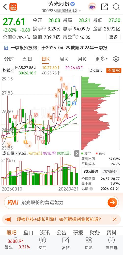 晚间话紫光股份:今日回顾与明日展望 今日回顾:早盘28.08元开,最高冲至28.21元,最低下探27.30元,最终收盘27.61元,下跌2.82%,单日振幅3.20%,股价全天运行区间集中在27.30-28.21元。全天成交量94.09万手,成交额25.92亿,换手率3.29%,量比0.70,资金活跃度较前一交易日回落;委比34.90%,买盘力量占优,内盘成交54.64万手,外盘成交39.45万手...
