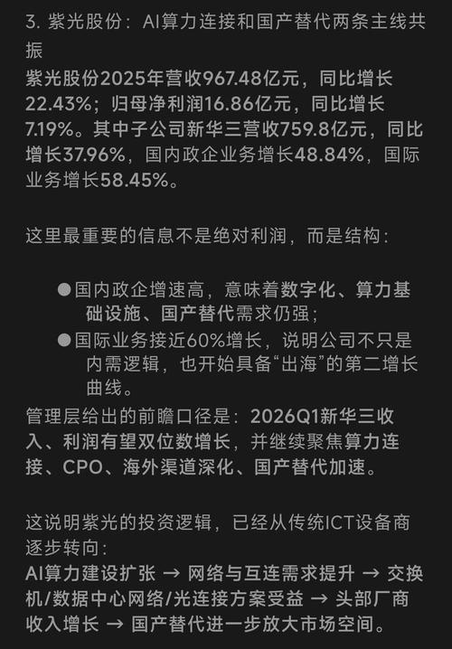 一般的,没有十倍百倍想象空间的股票,我是不会买的。紫光股份的成长空间广阔,AI算力长期高景气。加上全球智算投资持续爆发,以及国产替代深化,网络设备、服务器自主化率提升。海外业务扩张加速,其中新华三国际业务成第二增长曲线。技术逐