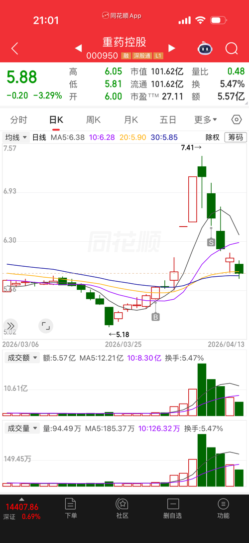 $重药控股(SZ000950)$4月1号,融资余额4.24亿,4月2号,一字板6.49,融资余额3.99亿,4月13号,今天融资余额4.92亿,融资盘买了9千多万,套牢至少10个点以上~融资盘不割肉还真的不敢买~~~又要耐心等待几个月了~~~融资盘能等吗?