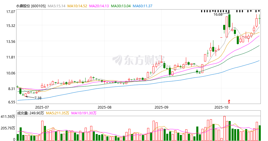 潜力个股分析 $永鼎股份(SH600105)$永鼎股份600105:国内通信设备领域的老牌龙头,在光通信和海外工程市场都有稳固的竞争优势。从走势看,这票已经连着涨了好几天,明显处于多头行情里,而且有加速上涨的趋势。均线跟情绪方面都是得到了很好的修复。5日均线跟10日均线都有拐头向上的迹象。技术上这种强势特征已经确立,加上通信设备行业近期走势也在向上跑赢大盘,从近期的业绩披露情况来看,业绩是实现了一...