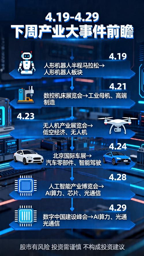 $万向钱潮(SZ000559)$ $海格通信(SZ002465)$ $浪潮信息(SZ000977)$ 4月18日,周末闲来无事,为大家梳理了4月19日至4月29日期间的重要产业事件,涉及人形机器人、工业母机、无人机、汽车、人工智能等多个领域,相关板块及标的值得关注。 一、4月19日(周日):2026北京亦庄人形机器人半程马拉松 影响板块:人形机器人 影响标的:长盛ZC、东方JG、金发KJ、万向QC...