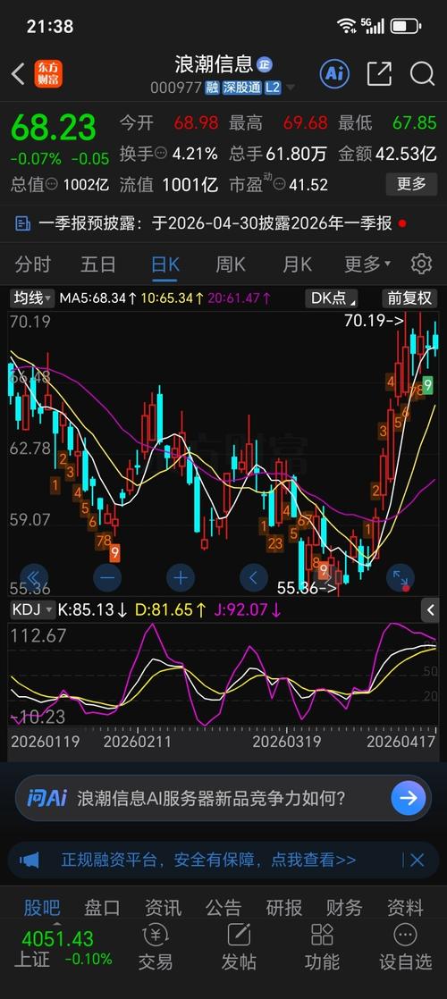 朋友们,请关注点赞,祝你股市一路长红 个股分析(以下内容均为个人观点) 1、$浪潮信息(SZ000977)$——今日微跌-0.07%,收68.23 2000股成本67.10,今天收68.23,持仓盈亏+1.68%。今天浪潮平盘微跌,连续三天没涨,资金还在别的算力方向轮动。 浪潮作为AI服务器大市值龙头,节奏会比较慢,但一季报预期好、AI服务器订单持续放量的逻辑在,68不破就继续拿。 2、$天赐材料(SZ002709)$...